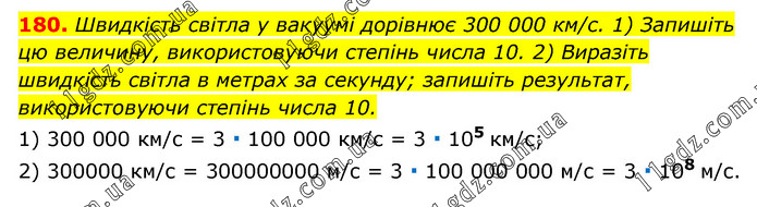 Швидкість світла у вакуумі дорівнює 300 000 км/с. 1) Запишіть цю величину, використовуючи степінь числа 10. 2) Виразіть швидкість світла в метрах за секунду; запишіть результат, використовуючи степінь числа 10. 1) 300 000 км/с = 3 ∙ 100 000 км/с = 3 ∙ 105 км/с; 2) 300000 км/с = 300000000 м/с = 3 ∙ 100 000 000 м/с = 3 ∙ 108 м/с.
