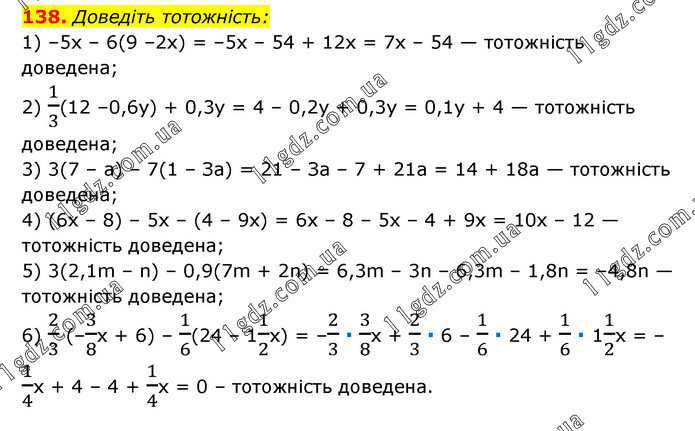 Доведіть тотожність: 1) –5x – 6(9 –2x) = –5x – 54 + 12x = 7x – 54 — тотожність доведена; 2) 1/3(12 –0,6y) + 0,3y = 4 – 0,2y + 0,3y = 0,1y + 4 — тотожність доведена; 3) 3(7 – а) – 7(1 – За) = 21 – За – 7 + 21а = 14 + 18а — тотожність доведена; 4) (6х – 8) – 5x – (4 – 9x) = 6х – 8 – 5х – 4 + 9x = 10х – 12 — тотожність доведена; 5) 3(2,1m – n) – 0,9(7m + 2n) = 6,3m – 3n – 6,3m – 1,8n = –4,8n — тотожність доведена; 6) 2/3 (–3/8x + 6) – 1/6(24 – 11/2x) = –2/3 ∙ 3/8x + 2/3 ∙ 6 – 1/6 ∙ 24 + 1/6 ∙ 11/2x = –1/4x + 4 – 4 + 1/4x = 0 – тотожність доведена.