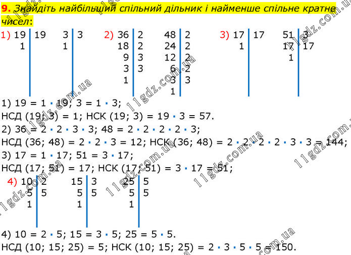 Знайдіть найбільший спільний дільник і найменше спільне кратне чисел: 1) 19 = 1 · 19; 3 = 1 · 3; НСД (19; 3) = 1; НСК (19; 3) = 19 · 3 = 57. 2) 36 = 2 · 2 · 3 · 3; 48 = 2 · 2 · 2 · 2 · 3; НСД (36; 48) = 2 · 2 · 3 = 12; НСК (36; 48) = 2 · 2 · 2 · 2 · 3 · 3 = 144; 3) 17 = 1 · 17; 51 = 3 · 17; НСД (17; 51) = 17; НСК (17; 51) = 3 · 17 = 51; 4) 10 = 2 · 5; 15 = 3 · 5; 25 = 5 · 5. НСД (10; 15; 25) = 5; НСК (10; 15; 25) = 2 · 3 · 5 · 5 = 150.