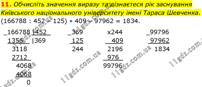 Обчисліть значення виразу та дізнаєтеся рік заснування Київського національного університету імені Тараса Шевченка. (166788 : 452 – 125) • 409 – 97962 = 1834.