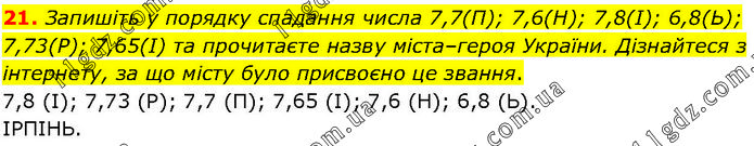 Запишіть у порядку спадання числа 7,7(П); 7,6(H); 7,8(І); 6,8(Ь); 7,73(Р); 7,65(І) та прочитаєте назву міста–героя України. Дізнайтеся з інтернету, за що місту було присвоєно це звання. 7,8 (І); 7,73 (Р); 7,7 (П); 7,65 (І); 7,6 (Н); 6,8 (Ь). ІРПІНЬ.