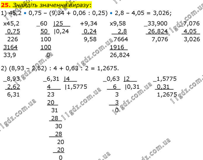 Знайдіть значення виразу: 1) 45,2 • 0,75 – (9,34 + 0,06 : 0,25) • 2,8 – 4,05 = 3,026; 2) (8,93 – 2,б2) : 4 + 0,63 : 2 = 1,2675.