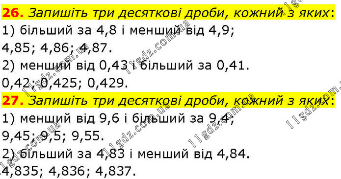 26. Запишіть три десяткові дроби, кожний з яких: 1) більший за 4,8 і менший від 4,9; 4,85; 4,86; 4,87. 2) менший від 0,43 і більший за 0,41. 0,42; 0,425; 0,429. 27. Запишіть три десяткові дроби, кожний з яких: 1) менший від 9,6 і більший за 9,4; 9,45; 9,5; 9,55. 2) більший за 4,83 і менший від 4,84. 4,835; 4,836; 4,837.
