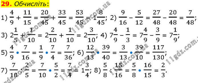 Обчисліть: 1) 4/9 + 11/15 = 20/45 + 33/45 = 53/45 = 18/45; 2) 9/16 – 5/12 = 27/48 – 20/48 = 7/48; 3) 21/5 + 1/10 = 22/10 + 1/10 = 23/10; 4) 74/9 – 1/3 = 74/9 – 3/9 = 71/9; 5) 4/9 • 7/16 = 1/9 • 7/4 = 7/36; 6) 12/13 • 39/40 = 3/13 • 39/10 = 117/130; 7) 7/10 : 2/5 = 7/10 • 5/2 = 7/4 = 13/4; 8) 5/8 : 15/16 = 5/8 • 16/15 = 2/3.
