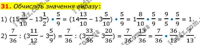 Обчисліть значення виразу: 1) (153/10 – 131/2) • 5/9 = (1413/10 – 135/10) • 5/9 = 18/10 • 5/9 = 9/5 • 5/9 = 1. 2) 7/36 : (311/12 – 35/9) = 7/36 : (333/36 – 320/36) = 7/36 : 13/36 = 7/36 • 36/13 = 7/13.