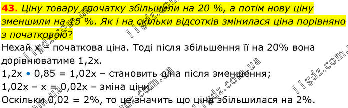Ціну товару спочатку збільшили на 20 %, а потім нову ціну зменшили на 15 %. Як і на скільки відсотків змінилася ціна порівняно з початковою? Нехай х – початкова ціна. Тоді після збільшення її на 20% вона дорівнюватиме 1,2х. 1,2х • 0,85 = 1,02х – становить ціна після зменшення; 1,02х – х = 0,02х – зміна ціни. Оскільки 0,02 = 2%, то це значить що ціна збільшилася на 2%.