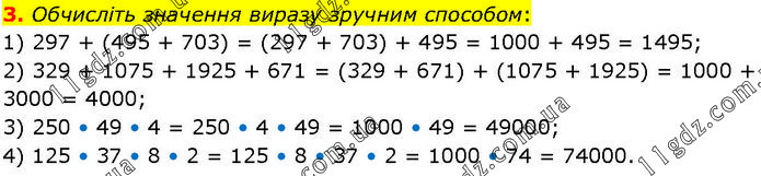 Обчисліть значення виразу зручним способом: 1) 297 + (495 + 703) = (297 + 703) + 495 = 1000 + 495 = 1495; 2) 329 + 1075 + 1925 + 671 = (329 + 671) + (1075 + 1925) = 1000 + 3000 = 4000; 3) 250 • 49 • 4 = 250 • 4 • 49 = 1000 • 49 = 49000; 4) 125 • 37 • 8 • 2 = 125 • 8 • 37 • 2 = 1000 • 74 = 74000.