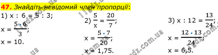 Знайдіть невідомий член пропорції: 1) х : 6 = 5 : 3; х = (5 • 6)/3; х = 10. 2) 5/х = 20/7; х = (5 • 7)/20; х = 1,75. 3) х : 12 = 13/24; х = (12 • 13)/24; х = 6,5.