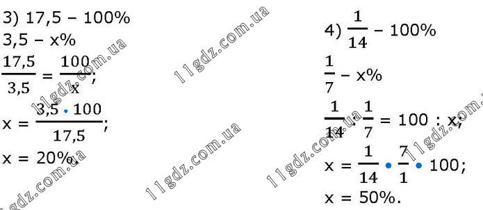 3) 17,5 – 100% 3,5 – х% 17,5/3,5 = 100/х; х = (3,5 • 100)/17,5; х = 20%. 4) 1/14 – 100% 1/7 – х% 1/14 : 1/7 = 100 : х; х = 1/14 • 7/1 • 100; х = 50%.