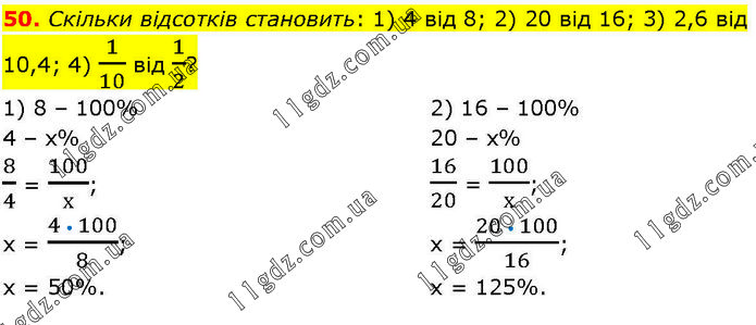 Скільки відсотків становить: 1) 4 від 8; 2) 20 від 16; 3) 2,6 від 10,4; 4) 1/10 від 1/2? 1) 8 – 100% 4 – х% 8/4 = 100/х; х = (4 • 100)/8; х = 50%. 2) 16 – 100% 20 – х% 16/20 = 100/х; х = (20 • 100)/16; х = 125%.