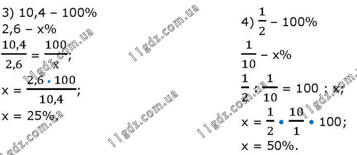 3) 10,4 – 100% 2,6 – х% 10,4/2,6 = 100/х; х = (2,6 • 100)/10,4; х = 25%. 4) 1/2 – 100% 1/10 – х% 1/2 : 1/10 = 100 : х; х = 1/2 • 10/1 • 100; х = 50%.