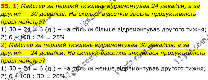 1) Майстер за перший тиждень відремонтував 24 девайси, а за другий — 30 девайсів. На скільки відсотків зросла продуктивність праці майстра? 1) 30 – 24 = 6 (д.) – на стільки більше відремонтував другого тижня; 2) 6 • 100 : 24 = 25% 2) Майстер за перший тиждень відремонтував 30 девайсів, а за другий — 24 девайси. На скільки відсотків знизилася продуктивність праці майстра? 1) 30 – 24 = 6 (д.) – на стільки менше відремонтував другого тижня; 2) 6 • 100 : 30 = 20%.