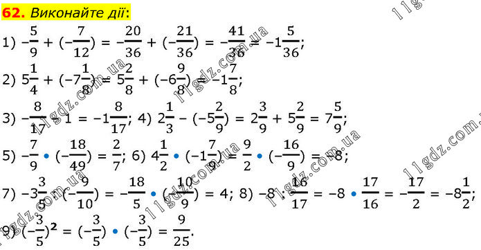 Виконайте дії: 1) –5/9 + (–7/12) = –20/36 + (–21/36) = –41/36 = –15/36; 2) 51/4 + (–71/8) = 52/8 + (–69/8) = –17/8; 3) –8/17 – 1 = –18/17; 4) 21/3 – (–52/9) = 23/9 + 52/9 = 75/9; 5) –7/9 • (–18/49) = 2/7; 6) 41/2 • (–17/9) = 9/2 • (–16/9) = –8; 7) –33/5 : (–9/10) = –18/5 • (–10/9) = 4; 8) –8 : 16/17 = –8 • 17/16 = –17/2 = –81/2; 9) (–3/5)2 = (–3/5) • (–3/5) = 9/25.