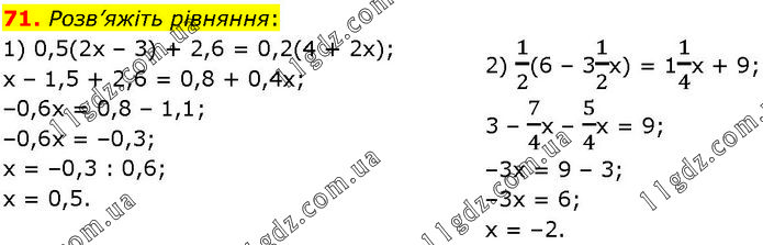 Розв’яжіть рівняння: 1) 0,5(2х – 3) + 2,6 = 0,2(4 + 2х); х – 1,5 + 2,6 = 0,8 + 0,4х; –0,6х = 0,8 – 1,1; –0,6х = –0,3; х = –0,3 : 0,6; х = 0,5. 2) 1/2(6 – 31/2х) = 11/4х + 9; 3 – 7/4х – 5/4х = 9; –3х = 9 – 3; –3х = 6; х = –2.