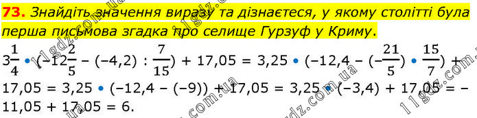 Знайдіть значення виразу та дізнаєтеся, у якому столітті була перша письмова згадка про селище Гурзуф у Криму. 31/4 • (–122/5 – (–4,2) : 7/15) + 17,05 = 3,25 • (–12,4 – (–21/5) • 15/7) + 17,05 = 3,25 • (–12,4 – (–9)) + 17,05 = 3,25 • (–3,4) + 17,05 = –11,05 + 17,05 = 6.