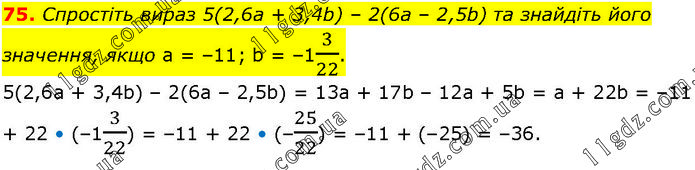 Спростіть вираз 5(2,6а + 3,4b) – 2(6а – 2,5b) та знайдіть його значення, якщо а = –11; b = –13/22. 5(2,6а + 3,4b) – 2(6а – 2,5b) = 13a + 17b – 12a + 5b = a + 22b = –11 + 22 • (–13/22) = –11 + 22 • (–25/22) = –11 + (–25) = –36.