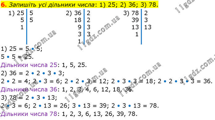 Запишіть усі дільники числа: 1) 25; 2) 36; 3) 78. 1) 25 = 5 • 5; 5 • 5 = 25. Дільники числа 25: 1, 5, 25. 2) 36 = 2 • 2 • 3 • 3; 2 • 2 = 4; 2 • 3 = 6; 2 • 2 • 3 = 12; 2 • 3 • 3 = 18; 2 • 2 • 3 • 3 = 36. Дільники числа 36: 1, 2, 3, 4, 6, 12, 18, 36. 3) 78 = 2 • 3 • 13; 2 • 3 = 6; 2 • 13 = 26; 3 • 13 = 39; 2 • 3 • 13 = 78. Дільники числа 78: 1, 2, 3, 6, 13, 26, 39, 78.