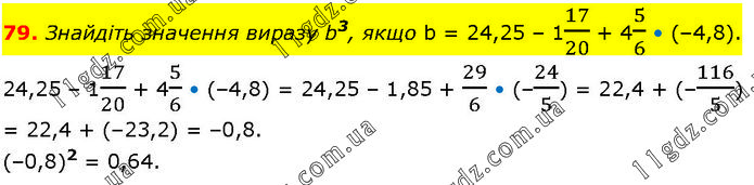 Знайдіть значення виразу b3, якщо b = 24,25 – 117/20 + 45/6 • (–4,8). 24,25 – 117/20 + 45/6 • (–4,8) = 24,25 – 1,85 + 29/6 • (–24/5) = 22,4 + (–116/5) = 22,4 + (–23,2) = –0,8. (–0,8)2 = 0,64.