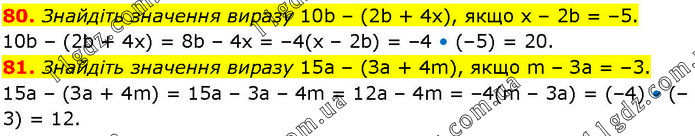 80. Знайдіть значення виразу 10b – (2b + 4х), якщо х – 2b = –5. 10b – (2b + 4х) = 8b – 4x = –4(x – 2b) = –4 • (–5) = 20. 81. Знайдіть значення виразу 15а – (За + 4m), якщо m – За = –3. 15а – (За + 4m) = 15a – 3a – 4m = 12a – 4m = –4(m – 3a) = (–4) • (–3) = 12.