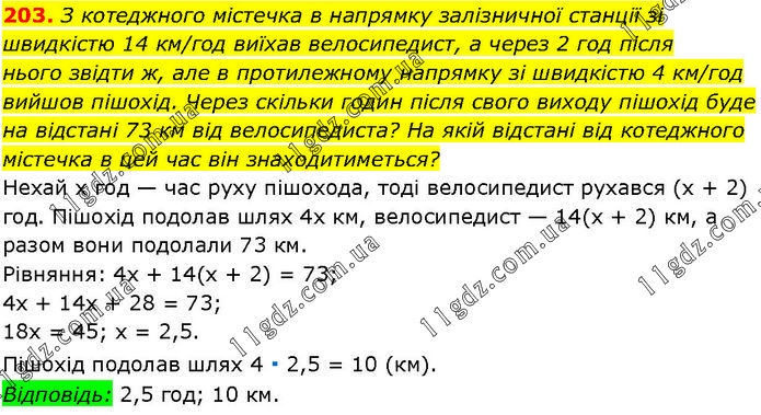З котеджного містечка в напрямку залізничної станції зі швидкістю 14 км/год виїхав велосипедист, а через 2 год після нього звідти ж, але в протилежному напрямку зі швидкістю 4 км/год вийшов пішохід. Через скільки годин після свого виходу пішохід буде на відстані 73 км від велосипедиста? На якій відстані від котеджного містечка в цей час він знаходитиметься? Нехай х год — час руху пішохода, тоді велосипедист рухався (х + 2) год. Пішохід подолав шлях 4х км, велосипедист — 14(х + 2) км, а разом вони подолали 73 км. Рівняння: 4х + 14(х + 2) = 73; 4х + 14х + 28 = 73; 18х = 45; х = 2,5. Пішохід подолав шлях 4 ∙ 2,5 = 10 (км). Відповідь: 2,5 год; 10 км.