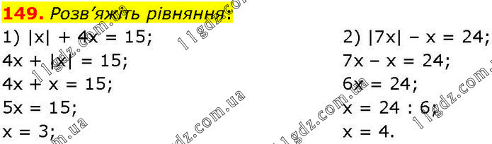 Розв’яжіть рівняння: 1) |х| + 4х = 15; 4x + |x| = 15; 4x + x = 15; 5x = 15; x = 3; 2) |7x| – x = 24; 7x – x = 24; 6x = 24; x = 24 : 6; x = 4.