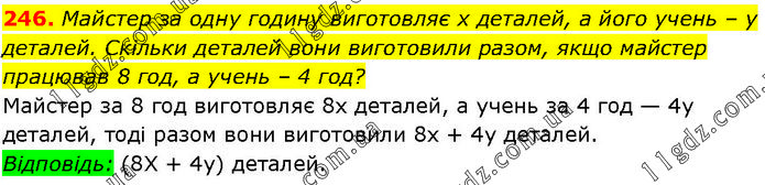 Майстер за одну годину виготовляє х деталей, а його учень – у деталей. Скільки деталей вони виготовили разом, якщо майстер працював 8 год, а учень – 4 год? Майстер за 8 год виготовляє 8х деталей, а учень за 4 год — 4у деталей, тоді разом вони виготовили 8х + 4у деталей. Відповідь: (8X + 4у) деталей.
