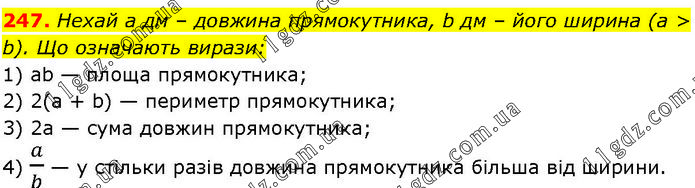 Нехай а дм – довжина прямокутника, b дм – його ширина (а > b). Що означають вирази: 1) аb — площа прямокутника; 2) 2(а + b) — периметр прямокутника; 3) 2а — сума довжин прямокутника; 4) a/b — у стільки разів довжина прямокутника більша від ширини.