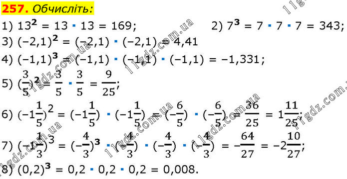 Обчисліть: 1) 132 = 13 ∙ 13 = 169; 2) 73 = 7 ∙ 7 ∙ 7 = 343; 3) (–2,1)2 = (–2,1) ∙ (–2,1) = 4,41 4) (–1,1)3 = (–1,1) ∙ (–1,1) ∙ (–1,1) = –1,331; 5) (3/5)2 = 3/5 ∙ 3/5 = 9/25; 6) (–11/5)2 = (–11/5) ∙ (–11/5) = (–6/5) ∙ (–6/5) = 36/25 = 111/25; 7) (–11/3)3 = (–4/3)3 ∙ (–4/3) ∙ (–4/3) ∙ (–4/3) = –64/27 = –210/27; 8) (0,2)3 = 0,2 ∙ 0,2 ∙ 0,2 = 0,008.