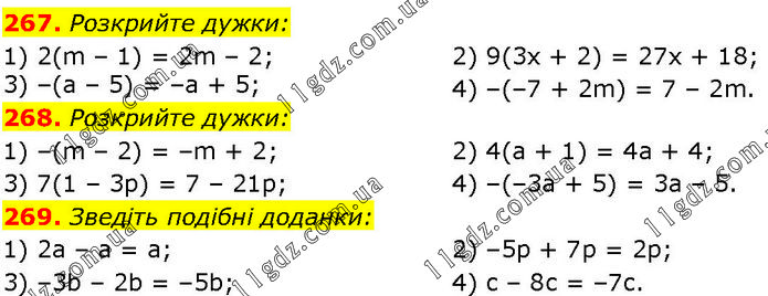 267. Розкрийте дужки: 1) 2(m – 1) = 2m – 2; 3) –(a – 5) = –a + 5; 2) 9(3x + 2) = 27x + 18; 4) –(–7 + 2m) = 7 – 2m. 268. Розкрийте дужки: 1) –(m – 2) = –m + 2; 3) 7(1 – 3p) = 7 – 21p; 2) 4(a + 1) = 4a + 4; 4) –(–3a + 5) = 3a – 5. 269. Зведіть подібні доданки: 1) 2a – a = a; 3) –3b – 2b = –5b; 2) –5p + 7p = 2p; 4) c – 8c = –7c.