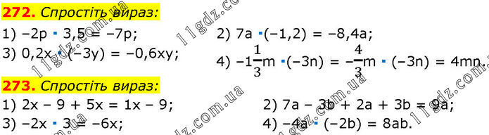 272. Спростіть вираз: 1) –2р ∙ 3,5 = –7р; 3) 0,2х ∙ (–3у) = –0,6ху; 2) 7а ∙(–1,2) = –8,4а; 4) –11/3m ∙(–3n) = –4/3m ∙ (–3n) = 4mn. 273. Спростіть вираз: 1) 2х – 9 + 5х = 1х – 9; 3) –2x ∙ 3 = –6х; 2) 7а – 3b + 2а + 3b = 9а; 4) –4а ∙ (–2b) = 8аb.