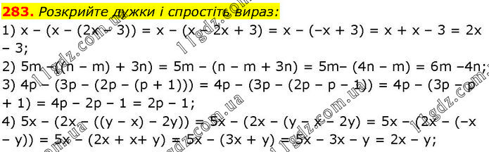 Розкрийте дужки і спростіть вираз: 1) х – (х – (2х – 3)) = х – (х – 2х + 3) = х – (–х + 3) = х + х – 3 = 2х – 3; 2) 5m –((n – m) + 3n) = 5m – (n – m + Зn) = 5m– (4n – m) = 6m –4n; 3) 4р – (Зр – (2р – (р + 1))) = 4р – (Зр – (2р – р – 1)) = 4р – (3р – р + 1) = 4р – 2р – 1 = 2р – 1; 4) 5х – (2х – ((у – х) – 2у)) = 5х – (2х – (у – х – 2у) = 5х – (2х – (–х – у)) = 5x – (2х + х+ у) = 5х – (3х + у) = 5x – 3х – у = 2х – у;
