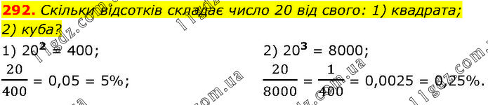 Скільки відсотків складає число 20 від свого: 1) квадрата; 2) куба? 1) 202 = 400; 2) 203 = 8000; 20/400 = 0,05 = 5%; 20/8000 = 1/400 = 0,0025 = 0,25%.