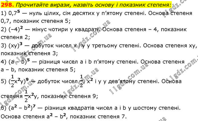 Прочитайте вирази, назвіть основу і показник степеня: 1) 0,75 — нуль цілих, сім десятих у п’ятому степені. Основа степеня 0,7, показник степеня 5; 2) (–4)2 — мінус чотири у квадраті. Основа степеня – 4, показник степеня 2; 3) (ху)3 — добуток чисел х і у y третьому степені. Основа степеня ху, показник степеня 3; 4) (a – b)5 — різниця чисел a і b п’ятому степені. Основа степеня a – b, показник степеня 5; 5) (1/2x2y)9 — добуток чисел 1/2, x2 і y у дев’ятому степені. Основа степеня 1/2х2у, показник степеня 9; 6) (а2 – b2)7 — різниця квадратів чисел а і b у шостому степені. Основа степеня а2 – b2, показник степеня 7.