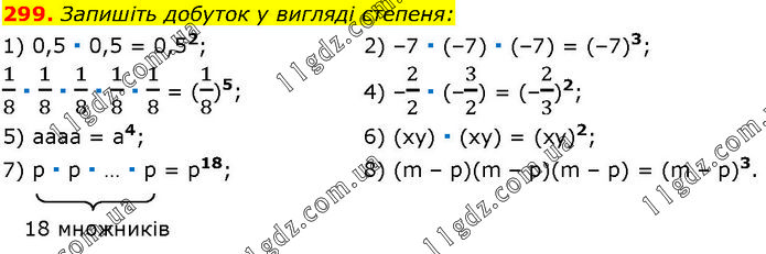 Запишіть добуток у вигляді степеня: 1) 0,5 ∙ 0,5 = 0,52; 2) –7 ∙ (–7) ∙ (–7) = (–7)3; 1/8 ∙ 1/8 ∙ 1/8 ∙ 1/8 ∙ 1/8 = (1/8)5; 4) –2/2 ∙ (–3/2) = (–2/3)2; 5) аааа = а4; 6) (ху) ∙ (ху) = (ху)2; 7) p ∙ p ∙ … ∙ p = p18; 18 множників 8) (m – p)(m – p)(m – p) = (m – p)3.