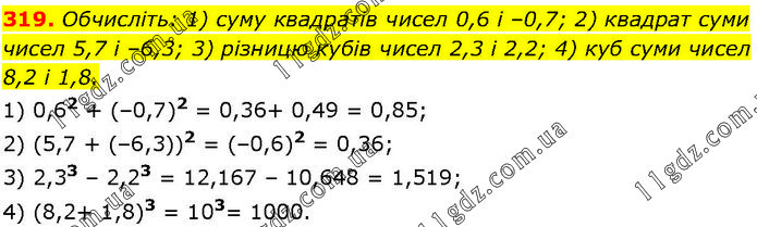 Обчисліть: 1) суму квадратів чисел 0,6 і –0,7; 2) квадрат суми чисел 5,7 і –6,3; 3) різницю кубів чисел 2,3 і 2,2; 4) куб суми чисел 8,2 і 1,8. 1) 0,62 + (–0,7)2 = 0,36+ 0,49 = 0,85; 2) (5,7 + (–6,3))2 = (–0,6)2 = 0,36; 3) 2,33 – 2,23 = 12,167 – 10,648 = 1,519; 4) (8,2+ 1,8)3 = 103= 1000.