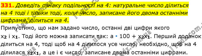 Доведіть ознаку подільності на 4: натуральне число ділиться на 4 тоді і тільки тоді, коли число, записане його двома останніми цифрами, ділиться на 4. Припустимо, що нам задано число, останні дві цифри якого x2 і х1. Тоді його можна записати так: а ∙ 100 + х2х1. Перший доданок ділиться на 4, тоді щоб на 4 ділилося усе число, необхідно, щоб на 4 ділилася x2x1, а це і є число, записане двома останніми цифрами.