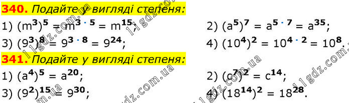 340. Подайте у вигляді степеня: 1) (m3)5 = m3 ∙ 5 = m15; 3) (93)8 = 93 ∙ 8 = 924; 2) (а5)7 = а5 ∙ 7 = а35; 4) (104)2 = 104 ∙ 2 = 108. 341. Подайте у вигляді степеня: 1) (a4)5 = a20; 3) (92)15 = 930; 2) (c7)2 = c14; 4) (1814)2 = 1828.