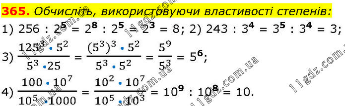 Обчисліть, використовуючи властивості степенів: 1) 256 : 25 = 28 : 25 = 23 = 8; 2) 243 : 34 = 35 : 34 = 3; 3) (125^3 • 5^2)/(5^3 •25) = ((5^3 )^3 • 5^2)/(5^3 • 5^2 ) = 5^9/5^3 = 56; 4) (100 • 10^7)/(10^(5 ) •1000) = (10^2 • 10^7)/(10^5 • 10^3 ) = 109 : 108 = 10.