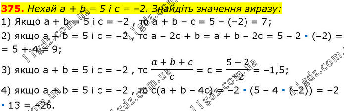 Нехай а + b = 5 і с = –2. Знайдіть значення виразу: 1) Якщо а + b = 5 і с = –2 , то а + b – с = 5 – (–2) = 7; 2) якщо a + b = 5 і с = –2 , то а – 2с + b = a + b – 2с = 5 – 2 ∙ (–2) = = 5 + 4 = 9; 3) якщо а + b = 5 і с = –2 , то (a + b + c)/c = c = (5 - 2)/(-2) = –1,5; 4) якщо а + b = 5 і с = –2 , то с(а + b – 4с) = –2 ∙ (5 – 4 ∙ (–2)) = –2 ∙ 13 = –26.