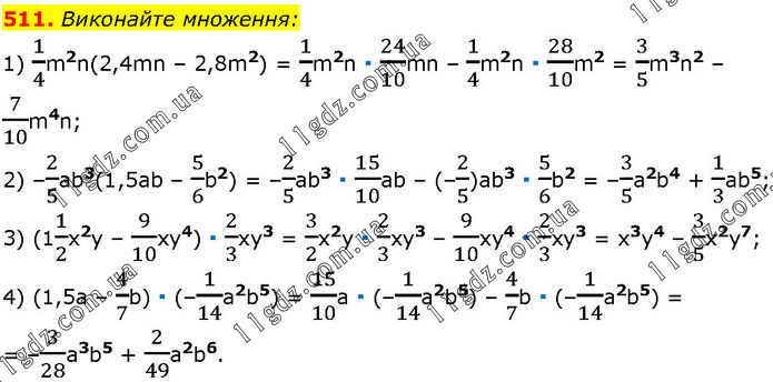 Виконайте множення: 1) 1/4m2n(2,4mn – 2,8m2) = 1/4m2n ∙ 24/10mn – 1/4m2n ∙ 28/10m2 = 3/5m3n2 – 7/10m4n; 2) –2/5ab3(1,5ab – 5/6b2) = –2/5ab3 ∙ 15/10ab – (–2/5)ab3 ∙ 5/6b2 = –3/5a2b4 + 1/3ab5; 3) (11/2x2y – 9/10xy4) ∙ 2/3xy3 = 3/2x2y ∙ 2/3xy3 – 9/10xy4 ∙ 2/3xy3 = x3y4 – 3/5x2y7; 4) (1,5a – 4/7b) ∙ (–1/14a2b5) = 15/10a ∙ (–1/14a2b5) – 4/7b ∙ (–1/14a2b5) = = –3/28a3b5 + 2/49a2b6.