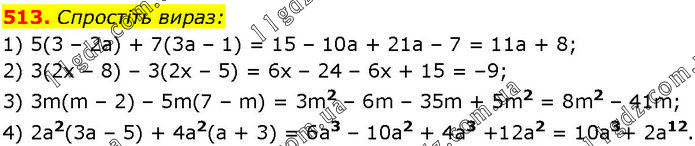 Спростіть вираз: 1) 5(3 – 2а) + 7(3а – 1) = 15 – 10а + 21а – 7 = 11а + 8; 2) 3(2х – 8) – 3(2х – 5) = 6x – 24 – 6х + 15 = –9; 3) 3m(m – 2) – 5m(7 – m) = 3m2 – 6m – 35m + 5m2 = 8m2 – 41m; 4) 2а2(3а – 5) + 4а2(а + 3) = 6а3 – 10а2 + 4а3 +12а2 = 10а3+ 2а12.