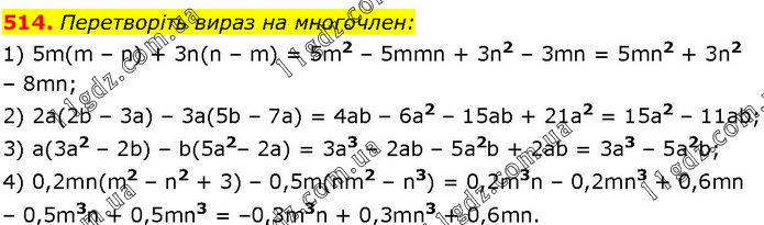 Перетворіть вираз на многочлен: 1) 5m(m – n) + 3n(n – m) = 5m2 – 5mmn + 3n2 – 3mn = 5mn2 + 3n2 – 8mn; 2) 2а(2b – 3а) – 3а(5b – 7а) = 4аb – 6а2 – 15аb + 21а2 = 15а2 – 11аb; 3) а(3а2 – 2b) – b(5а2– 2а) = 3а3 – 2аb – 5а2b + 2аb = 3а3 – 5а2b; 4) 0,2mn(m2 – n2 + 3) – 0,5m(nm2 – n3) = 0,2m3n – 0,2mn3 + 0,6mn – 0,5m3n + 0,5mn3 = –0,3m3n + 0,3mn3 + 0,6mn.