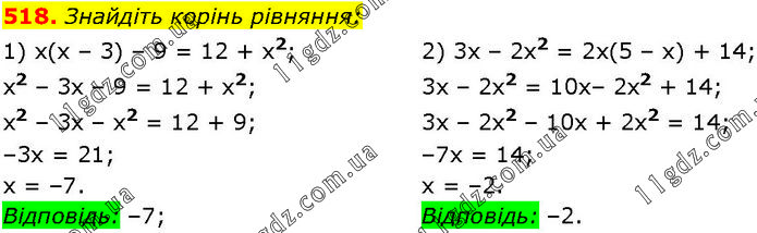 Знайдіть корінь рівняння: 1) x(x – 3) – 9 = 12 + x2; x2 – 3x – 9 = 12 + x2; x2 – 3x – x2 = 12 + 9; –3х = 21; x = –7. Відповідь: –7; 2) 3x – 2x2 = 2x(5 – x) + 14; 3x – 2x2 = 10x– 2x2 + 14; 3x – 2x2 – 10x + 2x2 = 14; –7x = 14; x = –2. Відповідь: –2.