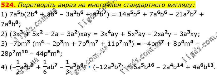 Перетворіть вираз на многочлен стандартного вигляду: 1) 7a5b(2b4 + ab5 – 3a2b6 + a3b7) = 14a5b5 + 7a6b6 – 21a7b7 + 7a8b8; 2) (3x3 + 5x2 – 2a – 3a2)xay = 3x4ay + 5x3ay – 2xa2y – 3a3xy; 3) –7pm3 (m4 – 2p3m + 7p6m7 + 11p7m3) = –4pm7 + 8p4m4 – 28p7m10 – 44p8m6; 4) (–1/2a2b9 + 1/6ab7 – 1/3a3b6) ∙ (–12a3b7) = 6a5b16 – 2a4b14 + 4a6b13.
