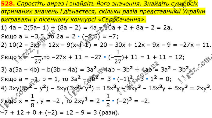 Спростіть вираз і знайдіть його значення. Знайдіть суму всіх отриманих значень і дізнаєтеся, скільки разів представники України вигравали у пісенному конкурсі «Свробачення». 1) 4a – 2(5a– 1) + (8a – 2) = 4a – 10a + 2 + 8a – 2 = 2a. Якщо a = –3,5, то 2а = 2 ∙ (–3,5) = –7; 2) 10(2 – 3x) + 12x – 9(x + 1) = 20 – 30x + 12x – 9x – 9 = –27x + 11. Якщо x = –1/27,то –27x + 11 = –27 ∙ (–1/27)+ 11 = 1 + 11 = 12; 3) а(3а – 4b) – b(3b – 4а) = 3а2 – 4ab – 3b2 + 4аb = 3а2 – 3b2. Якщо a = –1, b = 1, то 3a2 – 3b2 = 3 ∙ (–1)2 – 3 ∙ 12 = 0; 4) 3ху(5х2 – у2) – 5ху(3х2– у2) = 15х3у – 3ху3 – 15x3у + 5xy3 = 2xy3. Якщо х = 1/8 , у = –2 , то 2xy3 = 2 ∙ 1/8 ∙ (–2)3 = –2. –7 + 12 + 0 + (–2) = 12 – 9 = 3 (рази).