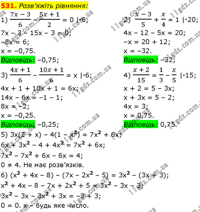 Розв’яжіть рівняння: 1) (7x - 3)/6 – (5x + 1)/2 = 0 |∙6; 7х – 3 – 15х – 3 = 0; –8х = 6; х = –0,75. Відповідь: –0,75; 2) (x - 3)/5 + x/4 = 1 |∙20; 4х – 12 – 5х = 20; –х = 20 + 12; х = –32. Відповідь: –32; 3) (4x + 1)/6 – (10x + 1)/6 = x |∙6; 4х + 1 + 10x + 1 = 6х; 14х – 6х = –1 – 1; 8х = –2; х = –0,25. Відповідь: –0,25; 4) (x + 2)/15 = 1/3 – x/5 |∙15; х + 2 = 5 – 3х; х + 3х = 5 – 2; 4х = 3; х = 0,75. Відповідь: 0,75. 5) 3х(2 + х) – 4(1 – х2) = 7х2 + 6х; 6х + 3х2 – 4 + 4х2 = 7х2 + 6х; 7х2 – 7х2 + 6х – 6х = 4; 0 ≠ 4. Не має розв’язків. 6) (х2 + 4х – 8) – (7х – 2х2 – 5) = 3х2 – (3х + 3); х2 + 4х – 8 – 7х + 2х2 + 5 = 3х2 – 3х – 3; 3х2 – 3х – 3х2 + 3х = –3 + 3; 0 = 0. х – будь яке число.