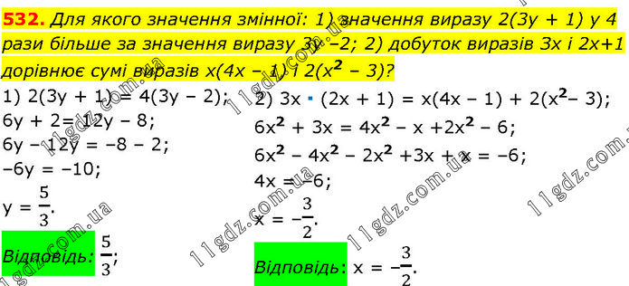 Для якого значення змінної: 1) значення виразу 2(3у + 1) у 4 рази більше за значення виразу 3у –2; 2) добуток виразів Зх і 2х+1 дорівнює сумі виразів х(4х – 1) і 2(х2 – 3)? 1) 2(3у + 1) = 4(3у – 2); 6у + 2= 12у – 8; 6y – 12y = –8 – 2; –6у = –10; y = 5/3. Відповідь: 5/3; 2) 3x ∙ (2х + 1) = х(4х – 1) + 2(х2– 3); 6х2 + 3х = 4х2 – х +2x2 – 6; 6x2 – 4x2 – 2х2 +3х + х = –6; 4х = –6; x = –3/2. Відповідь: х = –3/2.