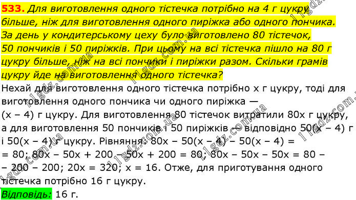 Для виготовлення одного тістечка потрібно на 4 г цукру більше, ніж для виготовлення одного пиріжка або одного пончика. За день у кондитерському цеху було виготовлено 80 тістечок, 50 пончиків і 50 пиріжків. При цьому на всі тістечка пішло на 80 г цукру більше, ніж на всі пончики і пиріжки разом. Скільки грамів цукру йде на виготовлення одного тістечка? Нехай для виготовлення одного тістечка потрібно х г цукру, тоді для виготовлення одного пончика чи одного пиріжка — (х – 4) г цукру. Для виготовлення 80 тістечок витратили 80x г цукру, а для виготовлення 50 пончиків і 50 пиріжків — відповідно 50(х – 4) г і 50(х – 4) г цукру. Рівняння: 80х – 50(х – 4) – 50(х – 4) = = 80; 80х – 50x + 200 – 50х + 200 = 80; 80х – 50х – 50х = 80 – – 200 – 200; 20х = 320; х = 16. Отже, для приготування одного тістечка потрібно 16 г цукру. Відповідь: 16 г.