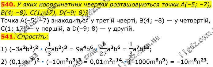 540. У яких координатних чвертях розташовуються точки А(–5; –7), B(4; –8), С(1; 17), D(–9; 8)? Точка A(–5; –7) знаходиться у третій чверті, B(4; –8) — у четвертій, С(1; 17) — у першій, a D(–9; 8) — у другій. 541. Спростіть: 1) (–3а2b3)2 ∙ (1/3ab2)3 = 9a4b6 ∙ 1/27a3b6 = 1/3a7b12; 2) (0,1mn7)2 ∙ (–10m2n3)3 = 0,01m2n14 ∙ (–1000m6n9) = –10m8n23.