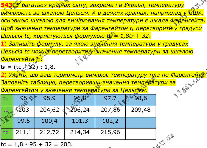 У багатьох країнах світу, зокрема і в Україні, температуру вимірюють за шкалою Цельсія. А в деяких країнах, наприклад у США, основною шкалою для вимірювання температури є шкала Фаренгейта. Щоб значення температури за Фаренгейтом tF перетворити у градуси Цельсія tc, користуються формулою tc = 1,8tF + 32. 1) Запишіть формулу, за якою значення температури у градусах Цельсія tc можна перетворити у значення температури за шкалою Фаренгейта tF. tF = (tc – 32) : 1,8. 2) Уявіть, що ваш термометр вимірює температуру тіла по Фаренгейту. Заповніть таблицю, перетворивши значення температури за Фаренгейтом у значення температури за Цельсієм.